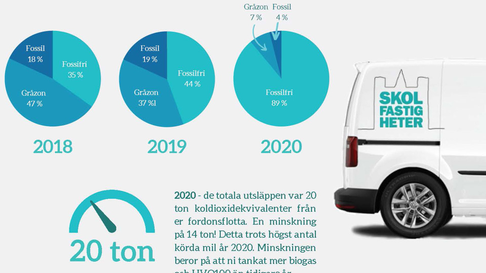 I sin kandidatuppsats undersökte studenterna hur förändringarna i Skolfastigheters fordonsflotta påverkat växthusgasutsläppen. Resultatet av undersökningen visar att andelen tankat fossilfritt drivmedel på Skolfastigheter ökade med 54% procentenheter 2018-2020. År 2020 är 89 % av drivmedlen fossilfria. Det har i sin tur lett till väsentligt minskade nivåer av utsläppt växthusgas.