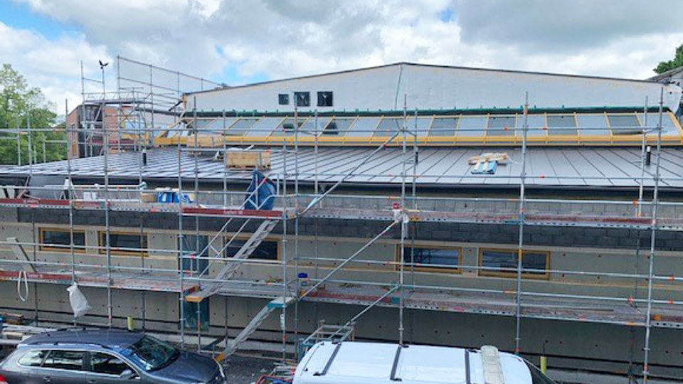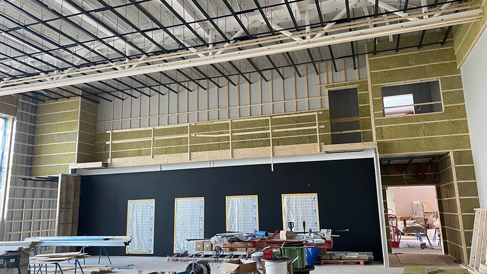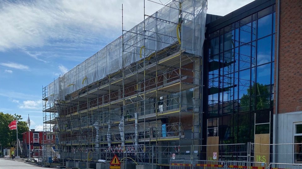 I arbetet med nya idrottshallen pågår murning av fasad och vi spikar även fasadpanel och genomför plåtarbeten på taket. Invändigt monteras väggar inför kommande moment med målning, plattsättning och golvläggning. Vi arbetar också med olika ventilations, rör- och elarbeten i byggnaden.
