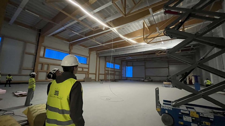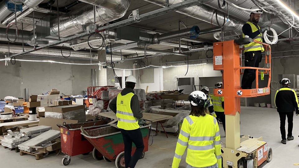 Vi har just nu mycket personal på plats och det pågår omfattande aktivitet av olika slag både utomhus och inomhus vid byggnadsplatsen. Invändigt arbetas det med ytskikt på golv, väggar och tak och vi gör diverse installationsarbeten. I delar av byggnaden har arbeten med inrednings- och idrottsutrustning också påbörjats.