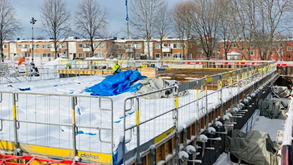 För hus 3, som inrymmer idrottshallen, är källarväggarna för skyddsrummet nu färdigställda och vi håller på med avslutande markarbeten inför kommande gjutningar av bottenplattan.