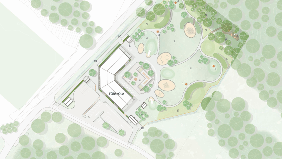 Byggnaden byggs i vinkel, där placeringen bidrar till att skapa en ljus och solig gård, med inspirerande och trygg miljö för förskolans barn. Den nya förskolan kommer förena lättillgängliga och säkra möjligheter att både lämna och hämta barn, samt att ta emot varuleveranser.