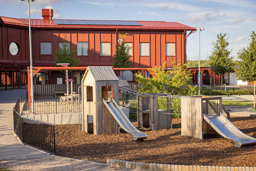 Österledens förskola är byggd med hållbarhet i fokus. Giftfria material har använts i konstruktionen av förskolans utemiljö och energiförsörjning sker via solcellspaneler som är monterade på byggnadens tak.